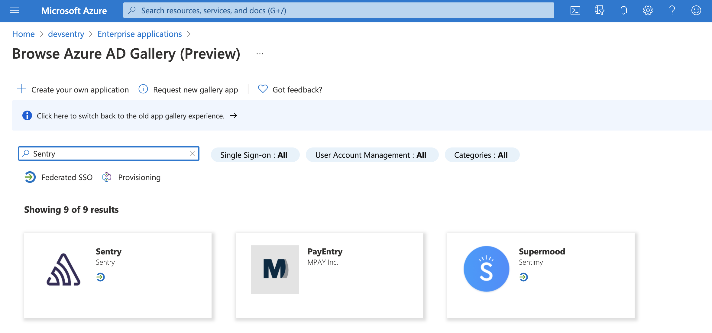 5. Return to the Overview page. In the search bar, enter Enterprise Applications, then navigate to it. Click "+ New application". Search for Sentry to create the application.