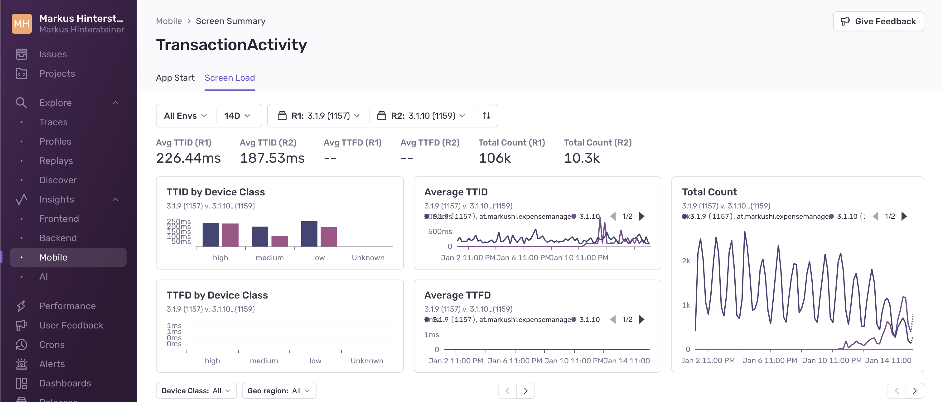 Here, you’ll see a breakdown of TTID and TTFD values by device class (high, medium, low, or unknown), across your selected releases. This will help you understand how users with different device performance levels are being affected.