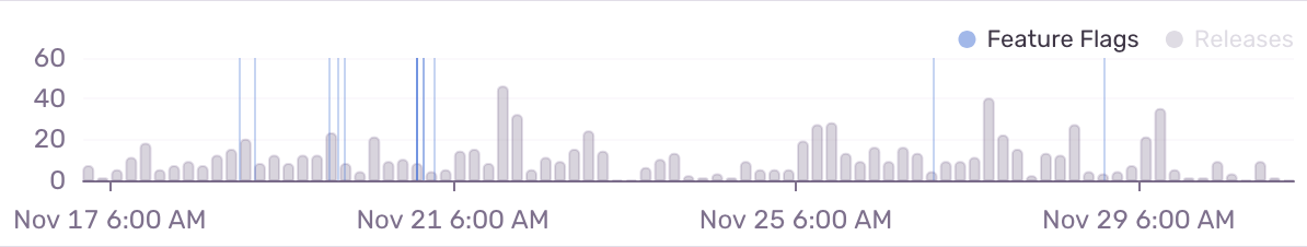 Enabling a change tracking integration will enable annotations on the event volume chart. These lines mark feature flag changes and can help identify regressions caused by a feature flag definition change.