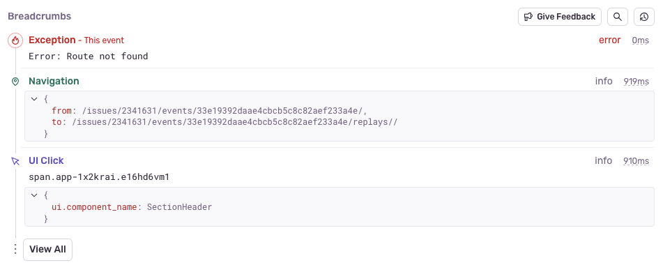 Breadcrumbs provide a history and timeline leading up to the error event. These can include things like HTTP requests, log statements from the console or server, and DOM (document object model) events in JavaScript.