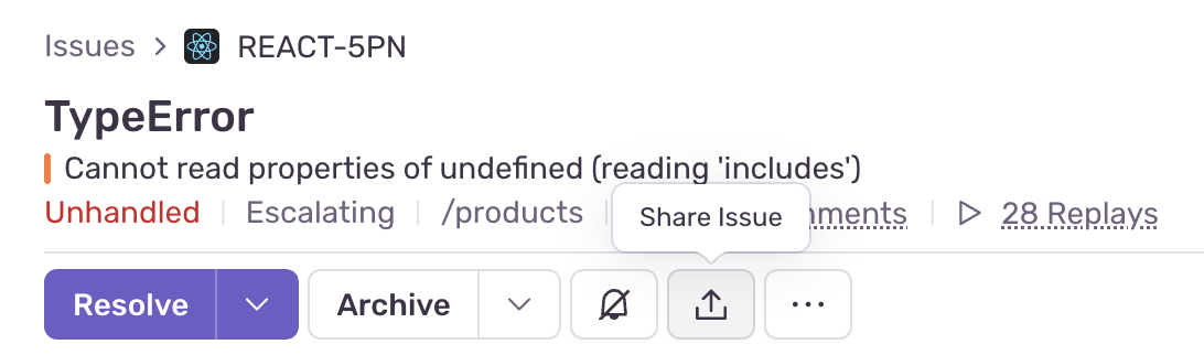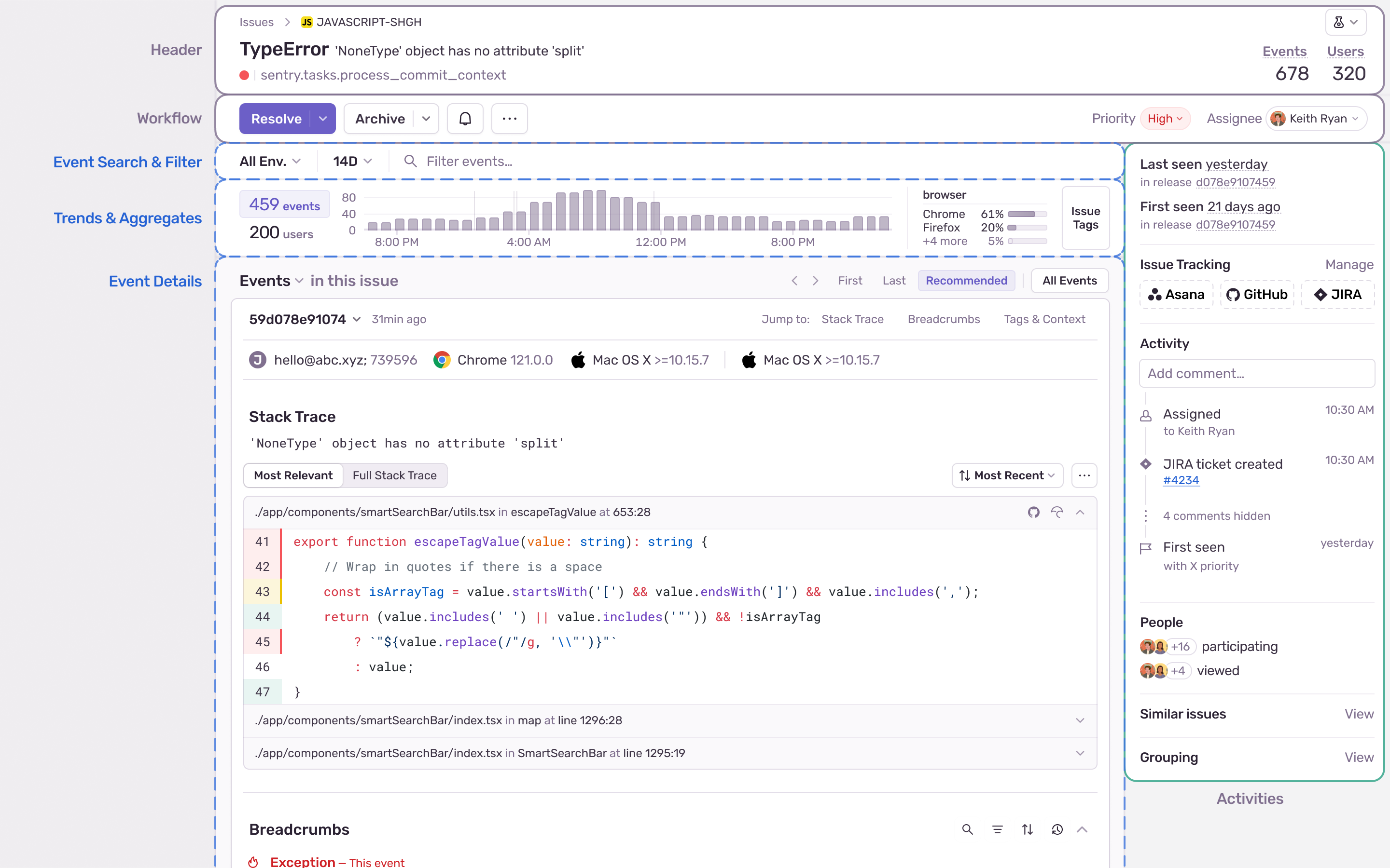 The header contains high-level information about the issue such as the error message, total counts of how often it has been seen, and how many users it has affected. Actions such as assigning, resolving, sharing, and archiving are also here.