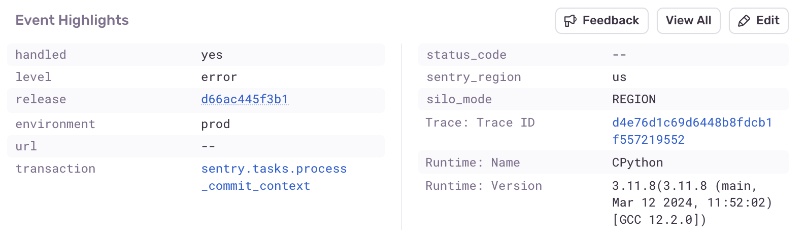 Event Highlights are specific tags and context items that have been promoted to the top of the page for quicker debugging. If you miss tags being at the top of the page, click "View All" to go to their new location under the stack trace.